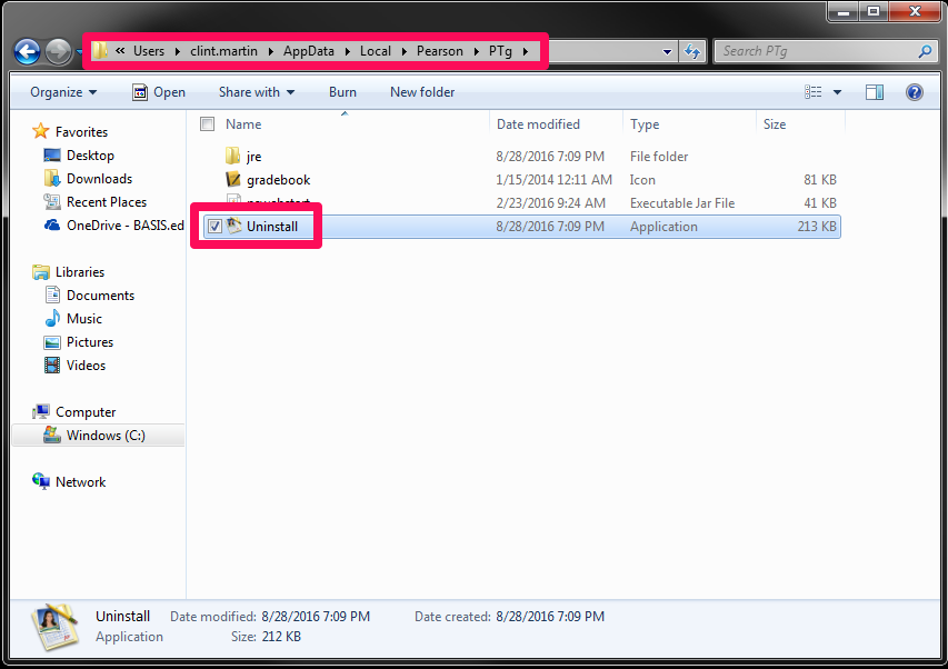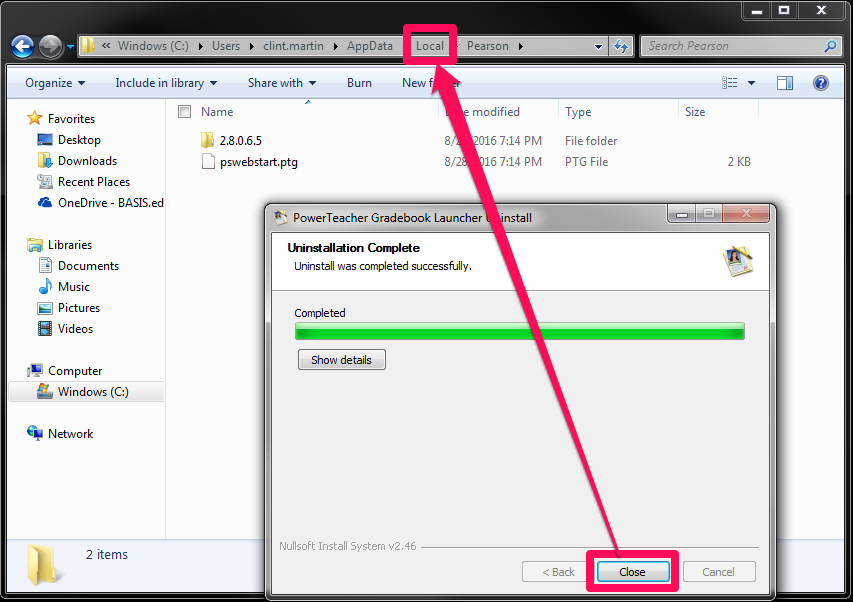 5) Go to C:\Users\first.last\AppData\Local and delete the Pearson folder & remaining contents